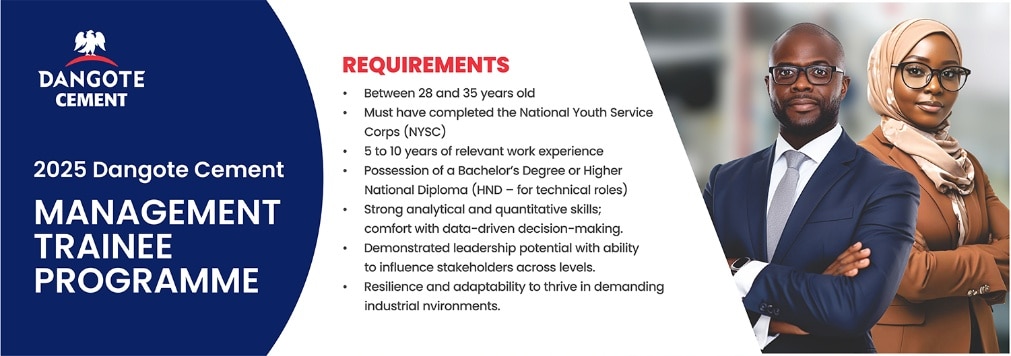 The Dangote Cement Plc Management Trainee Programme is an 18-month journey designed to prepare high-potential professionals for leadership roles through cross-functional experience, classroom learning, executive mentorship, and hands-on projects.